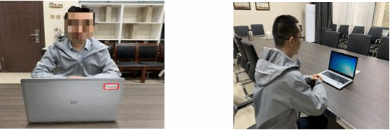 第一机位从正面拍摄,放置在距离本人30cm左右处,第二机位(监考机位)从考生侧后方45°距离本人30cm左右处拍摄,确保第一机位和第二机位分别从考生面前和身后完整拍摄到考生全身,复试小组能够从第二机位清晰地看到第一机位屏幕。效果图如下。